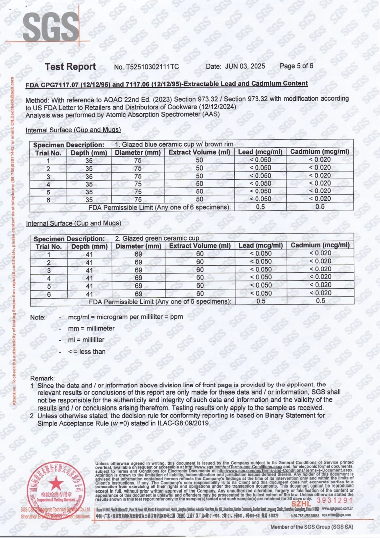 Food Contact Safety Testing Report By SGS